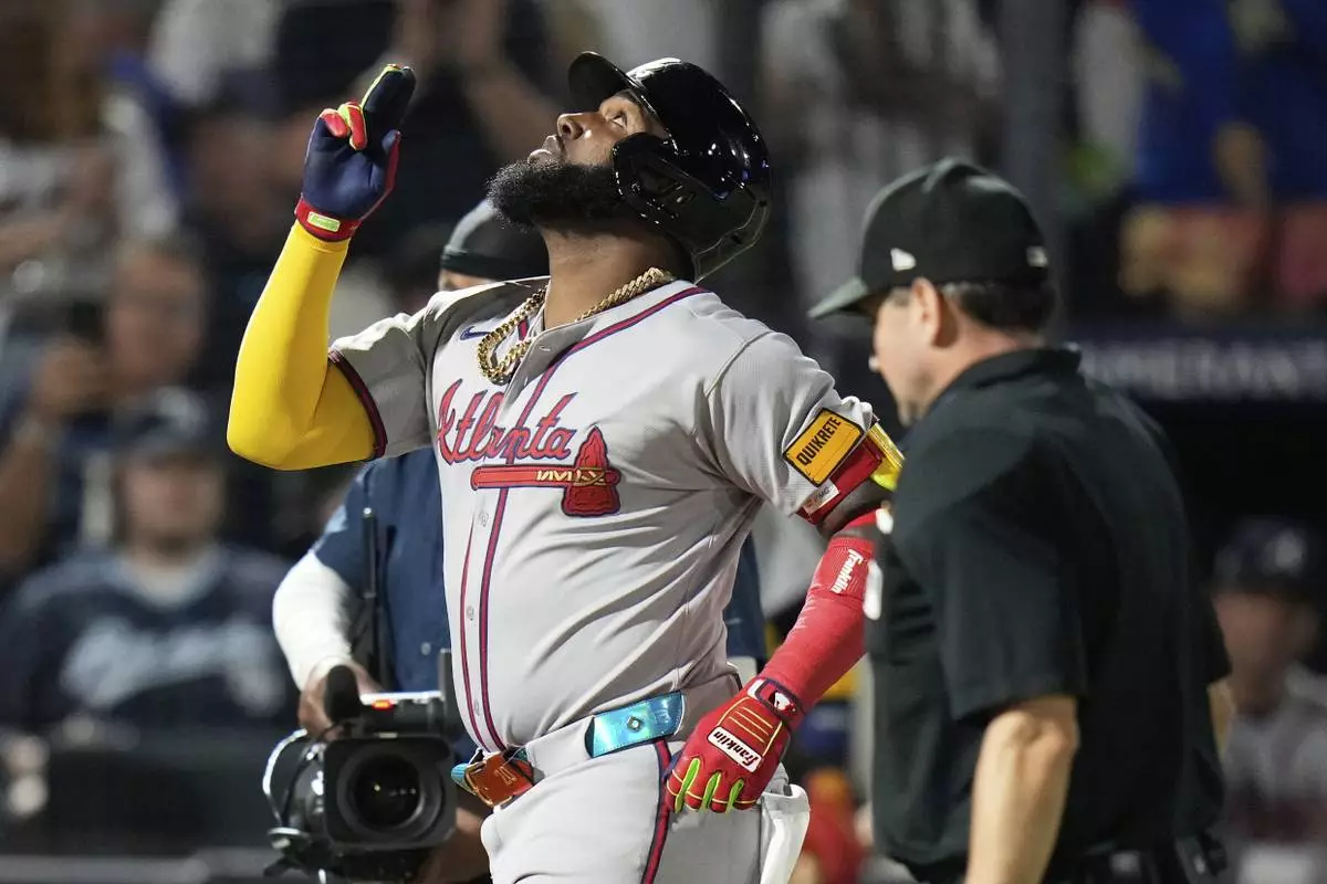 Atlanta Braves' Marcell Ozuna celebrates after his solo home run off Tampa Bay Rays pitcher Edwin Uceta during the eighth inning of a baseball game Friday, April 11, 2025, in Tampa, Fla. (AP Photo/Chris O'Meara)