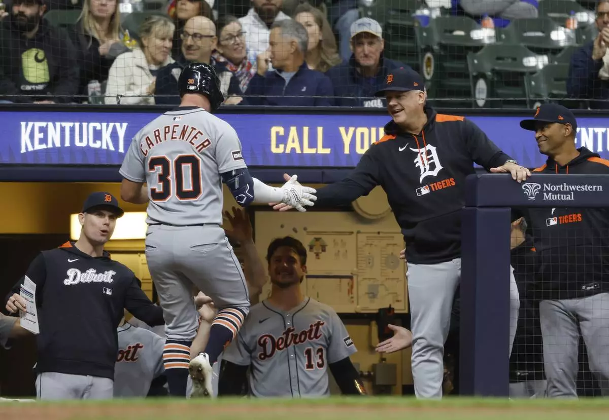 Detroit Tigers' Kerry Carpenter (30) receives congratulations after hitting a home run during the fifth inning of a baseball game against the Milwaukee Brewers, Monday, April 14, 2025, in Milwaukee. (AP Photo/Jeffrey Phelps)