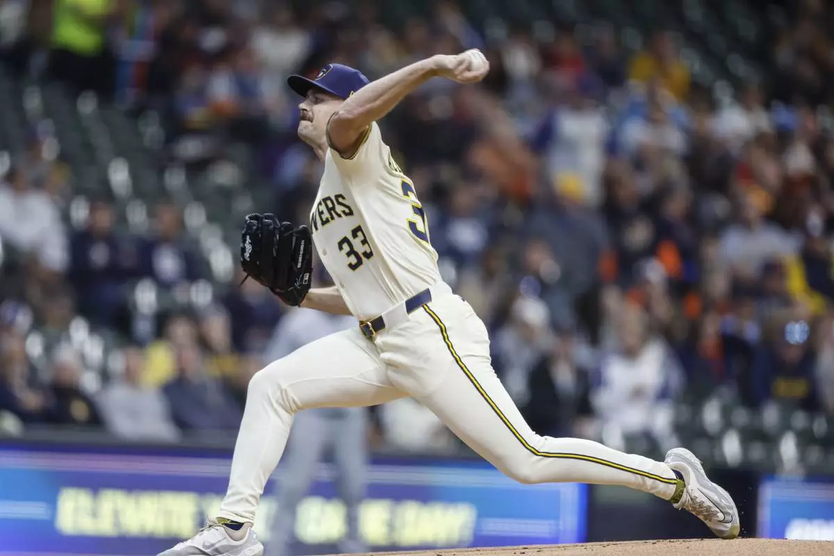 Milwaukee Brewers pitcher Tyler Alexander throws to the Detroit Tigers during the first inning of a baseball game Monday, April 14, 2025, in Milwaukee. (AP Photo/Jeffrey Phelps)