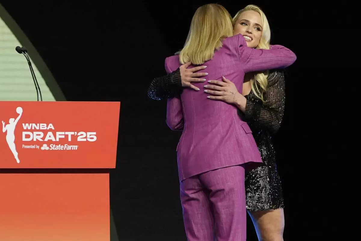 TCU's Hailey Van Lith, right, embraces WNBA commissioner Cathy Engelbert after being selected 11th overall by the Chicago Sky during the first round of the WNBA basketball draft, Monday, April 14, 2025, in New York. (AP Photo/Pamela Smith)
