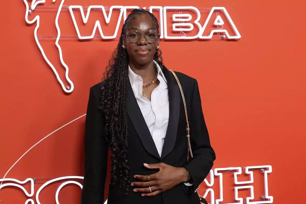 Dominique Malonga poses before the WNBA basketball draft, Monday, April 14, 2025, in New York. (AP Photo/Pamela Smith)