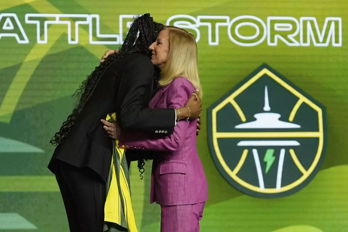 Dominique Malonga, left, embraces WNBA commissioner Cathy Engelbert after being selected second overall by the Seattle Storm during the first round of the WNBA basketball draft, Monday, April 14, 2025, in New York. (AP Photo/Pamela Smith)