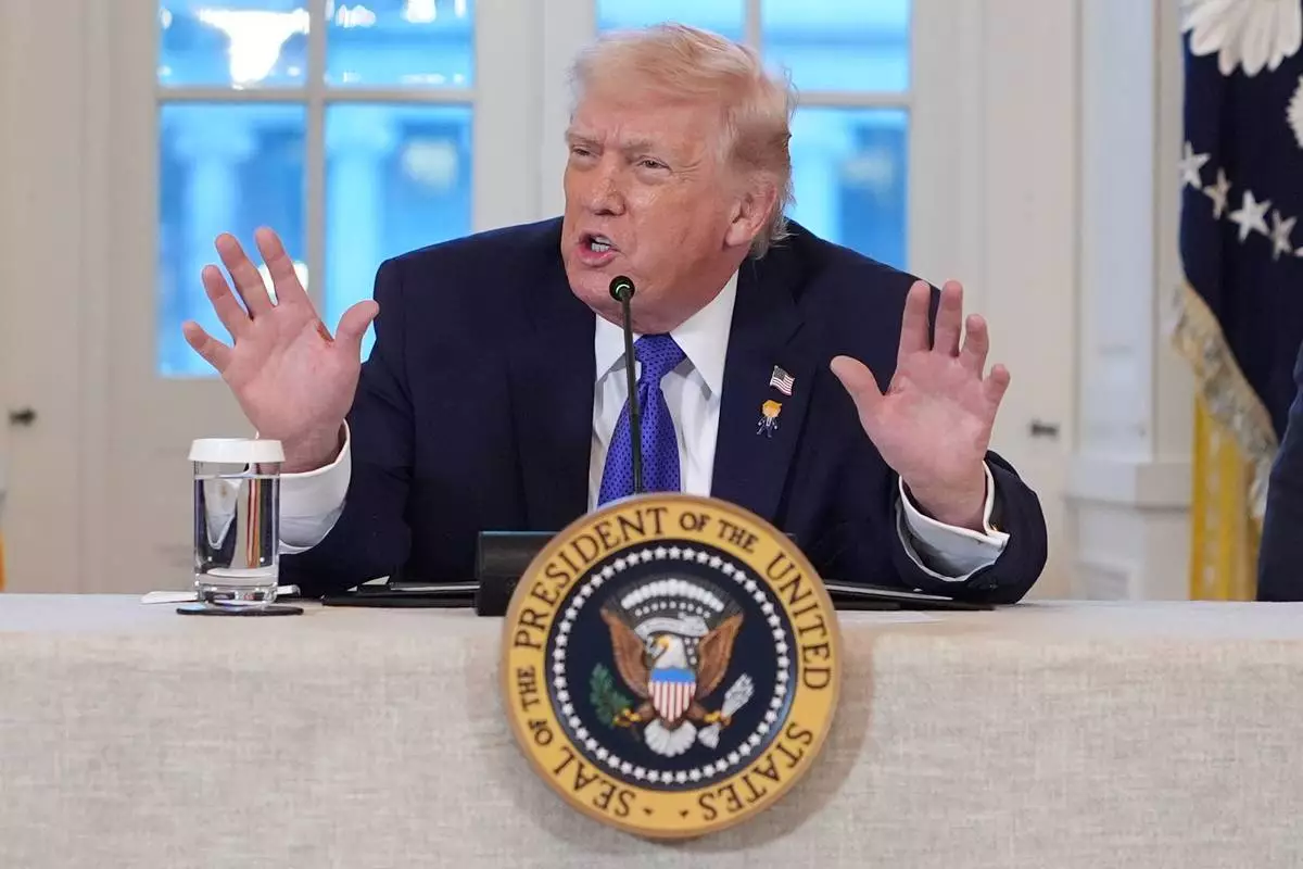 President Donald Trump gestures to the crowd as he departs after welcoming the 2025 College Football National Champions, the Ohio State University football team, during an event on the South Lawn of the White House, Monday, April 14, 2025, in Washington. (AP Photo/Manuel Balce Ceneta)