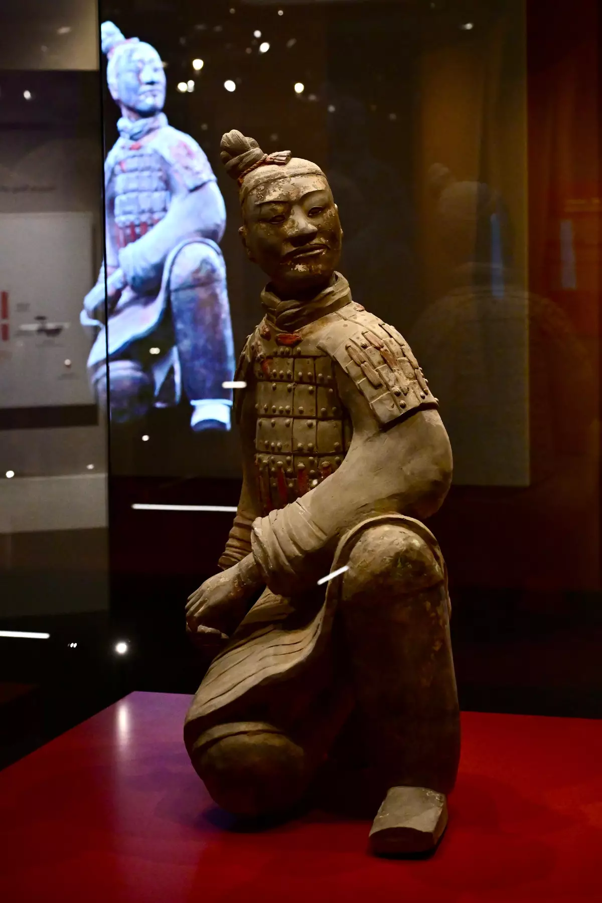 Highlight exhibits include three terracottas from the Qin dynasty which are grade-one national treasures, and are on display in Hong Kong for the first time, including the Terracotta General, the highest-ranking warrior yet uncovered at the Terracotta Army Pits; the Terracotta Kneeling Musician believed to be striking a musical instrument; and the Terracotta Kneeling Archer, on which traces of red pigment from over 2 000 years ago can still be seen on the armour. The terracottas are displayed independently in glass showcases transparent on the four sides, allowing visitors to appreciate from all angles.