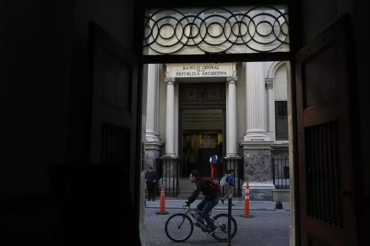 A cyclist rides past the Central Bank in Buenos Aires, Argentina, Monday, April 14, 2025. (AP Photo/Natacha Pisarenko)