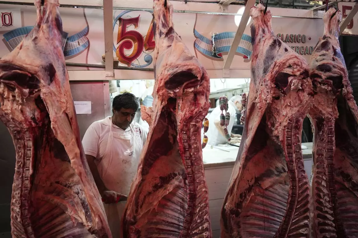 A worker cuts meat at a butcher shop in Buenos Aires, Argentina, Monday, April 14, 2025. (AP Photo/Natacha Pisarenko)