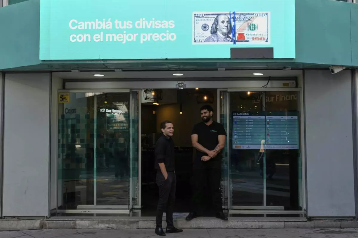 Workers at a currency exchange house stand at the store's entrance in Buenos Aires, Argentina, Monday, April 14, 2025. (AP Photo/Natacha Pisarenko)
