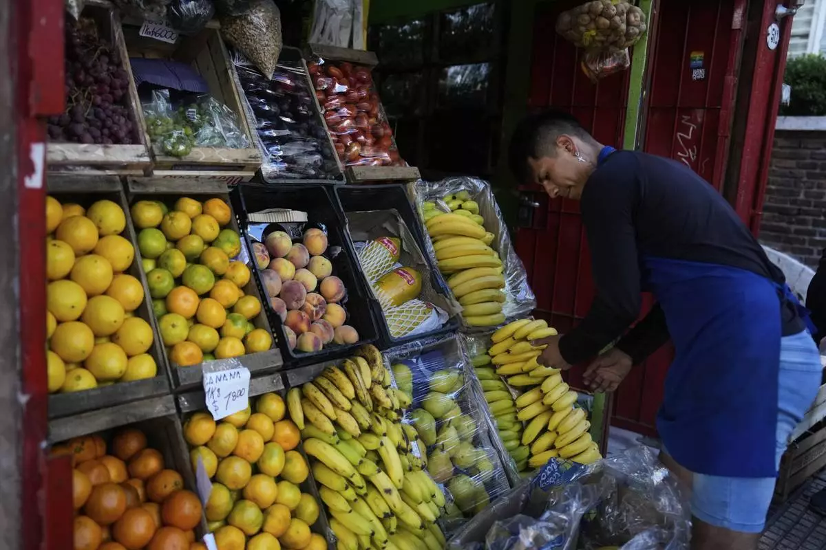 A produce vendor arranges bananas at his store in Buenos Aires, Argentina, Monday, April 14, 2025. (AP Photo/Natacha Pisarenko)