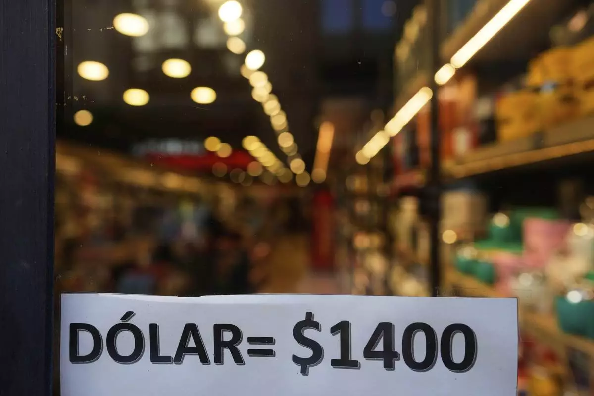 A sign displays the exchange rate between the U.S. dollar and the Argentine peso that is used at a store in Buenos Aires, Argentina, Monday, April 14, 2025. (AP Photo/Natacha Pisarenko)