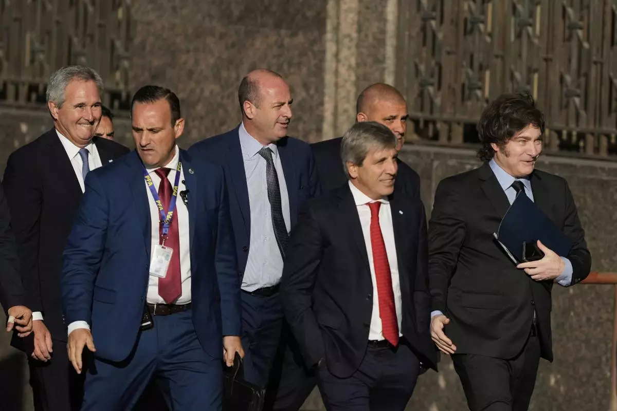 Argentina's President Javier Milei, right, and his Economy Minister Luis Caputo, second from right, enter the Economy Ministry after meeting with US Treasury Secretary Scott Bessent in Buenos Aires, Argentina, Monday, April 14, 2025. (AP Photo/Natacha Pisarenko)