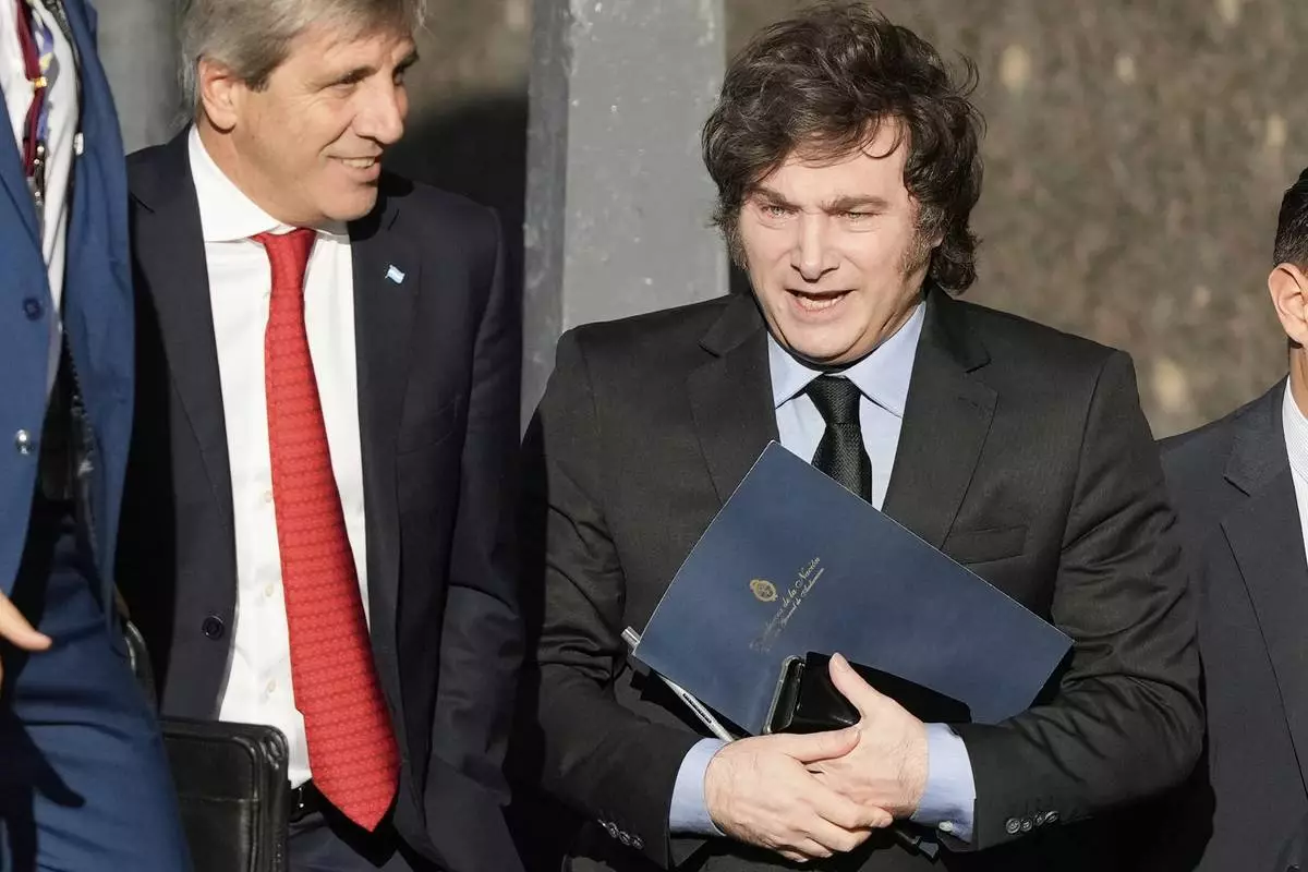 Argentine President Javier Milei, right, and his Economy Minister Luis Caputo enter the Economy Ministry after a meeting with US Treasury Secretary Scott Bessent in Buenos Aires, Argentina, Monday, April 14, 2025. (AP Photo/Natacha Pisarenko)