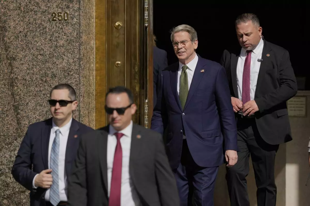 U.S Treasury Secretary Scott Bessent, second from right, leaves Argentina's Economy Ministry to head to the government house in Buenos Aires, Monday, April 14, 2025. (AP Photo/Natacha Pisarenko)