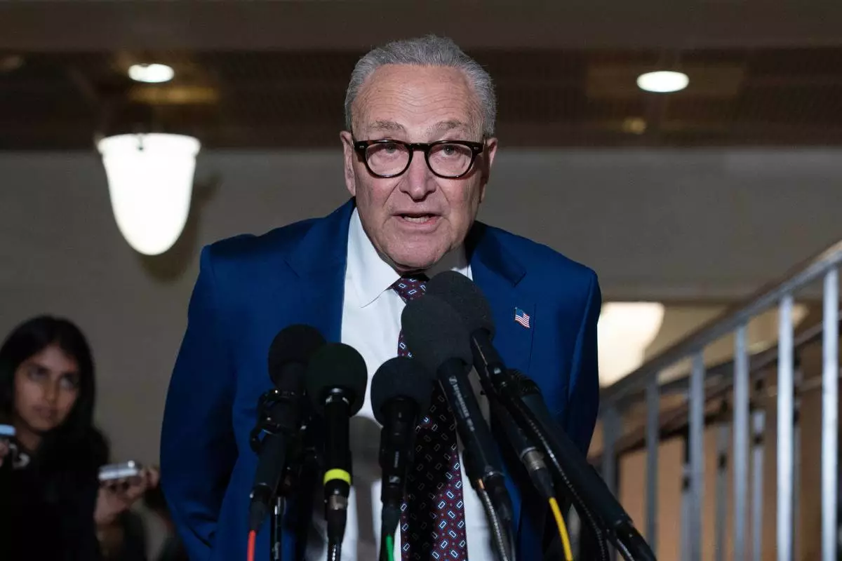 Senate Minority Leader Chuck Schumer, D-N.Y., speaks to reporters after a closed-door briefing on Capitol Hill, Monday, Jan. 5, 2026, in Washington, after the U.S. captured Venezuelan President Nicolás Maduro and his wife in a military operation. (AP Photo/Jose Luis Magana)