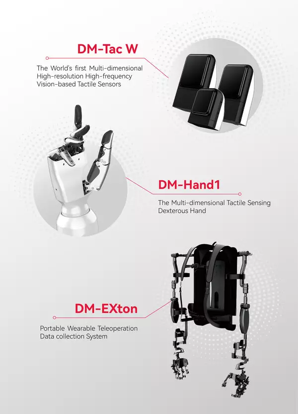 SHENZHEN, China, April 16, 2025 /PRNewswire/ -- Daimon Robotics officially launched the innovative product line on April 16, including the world's first Multi-dimensional High-resolution High-frequency Vision-based Tactile Sensors DM-Tac W, the Multi-dimensional Tactile Sensing Dexterous Hand DM-Hand1, and Portable Wearable Teleoperation Data collection System,DM-EXton.