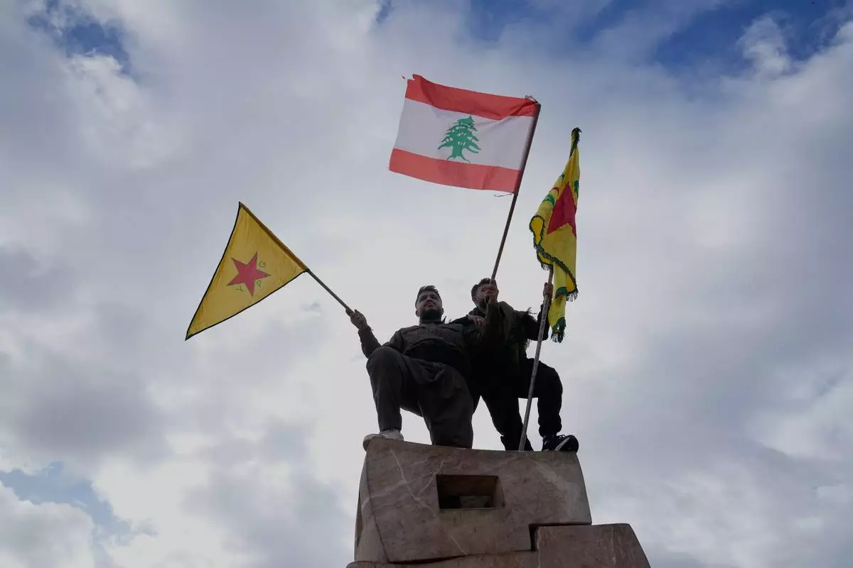 Kurdish citizens wave their group and Lebanese flags during a protest against the Syrian government military operation in Aleppo, in front the United Nations headquarters in Beirut, Lebanon, Saturday, Jan. 10, 2026. (AP Photo/Hussein Malla)
