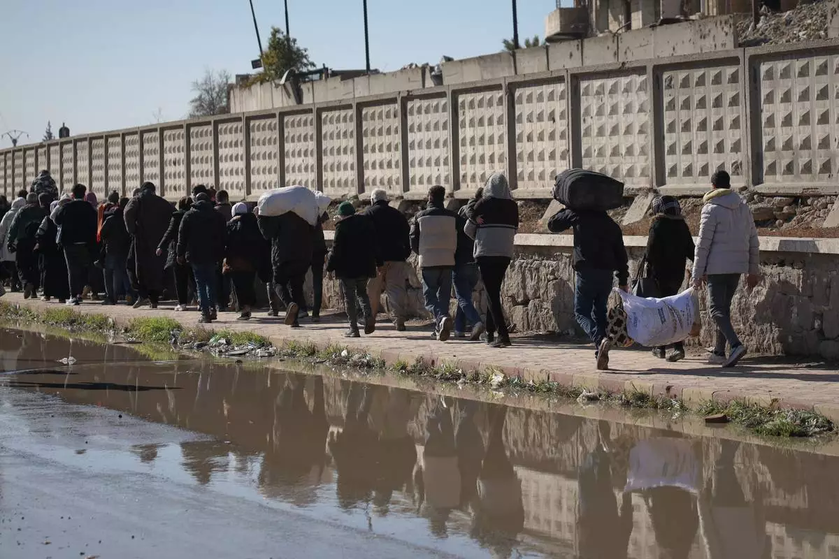 Civilians evacuate an area of the Sheikh Maqsoud neighborhood, where clashes between government forces and Kurdish fighters have been taking place in the northern city of Aleppo, Syria, Saturday, Jan. 10, 2026. (AP Photo/Omar Albam)