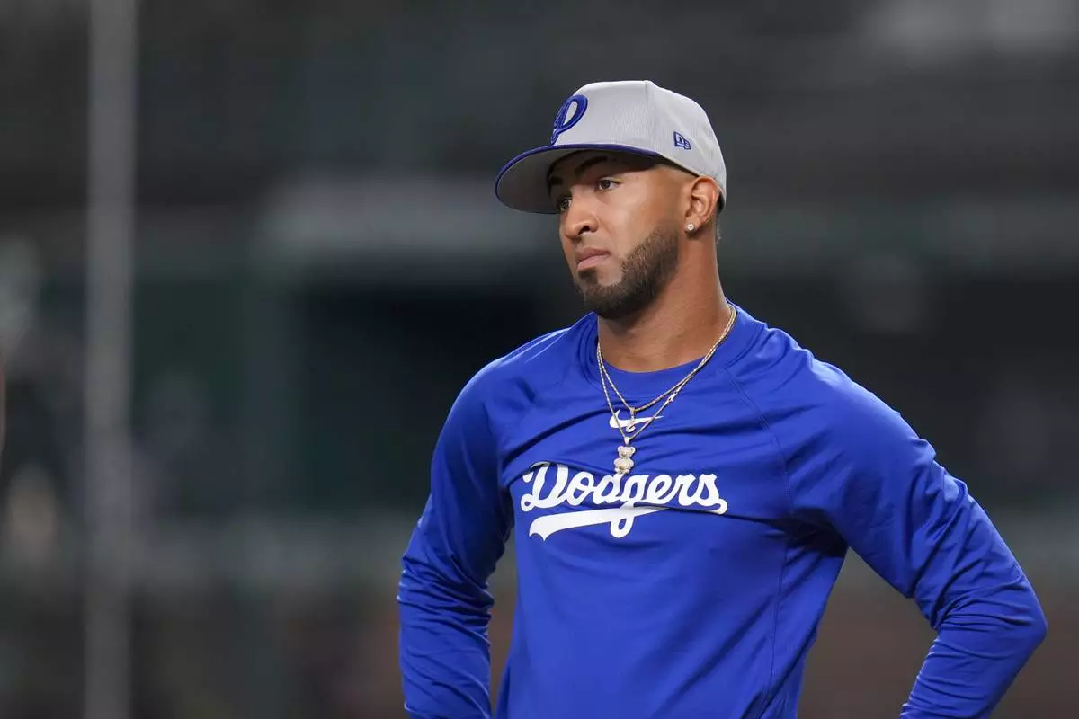 Los Angeles Dodgers designated hitter Eddie Rosario looks on prior to a baseball game against the Texas Rangers Friday, April 18, 2025, in Arlington, Texas. (AP Photo/Julio Cortez)