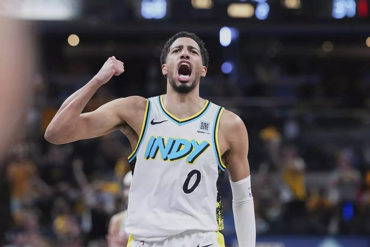 Indiana Pacers guard Tyrese Haliburton (0) celebrates in the first half of Game 4 against the Cleveland Cavaliers in the Eastern Conference semifinals of the NBA basketball playoffs in Indianapolis, Sunday, May 11, 2025. (AP Photo/Michael Conroy)