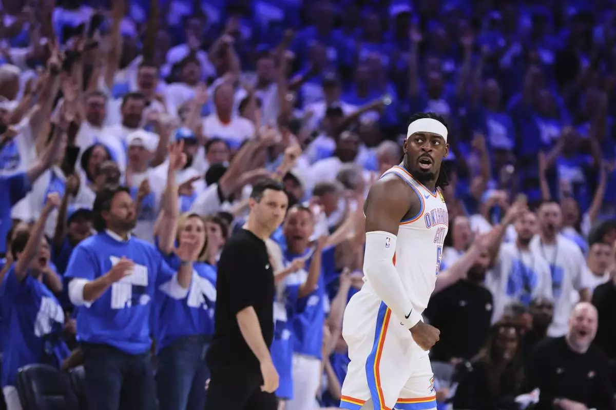 Fans cheer as Oklahoma City Thunder's Luguentz Dort celebrates sinking a three-pointer in the second half of Game 5 of an NBA basketball second-round playoff series against the Denver Nuggets Tuesday, May 13, 2025, in Oklahoma City. (AP Photo/Nate Billings)