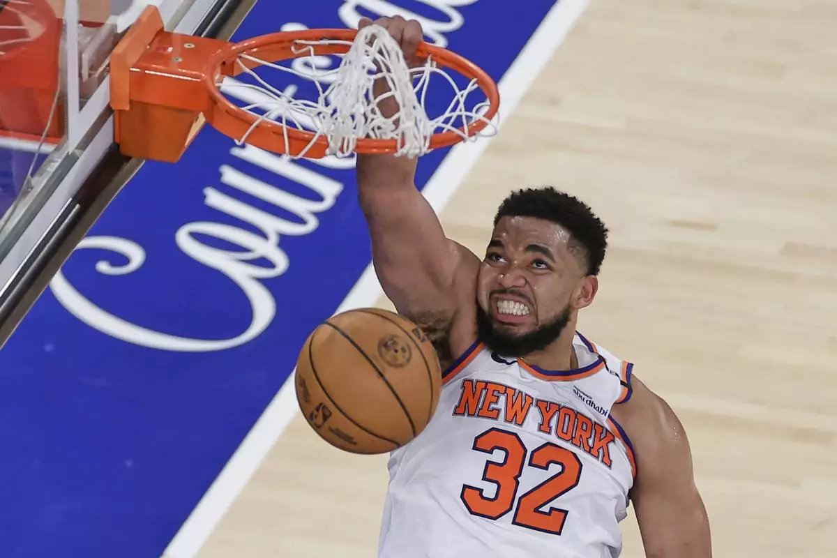 New York Knicks center Karl-Anthony Towns (32) scores against the Indiana Pacers during the fourth quarter of Game 5 of the NBA basketball Eastern Conference final, Thursday, May 29, 2025, in New York. (AP Photo/Adam Hunger)
