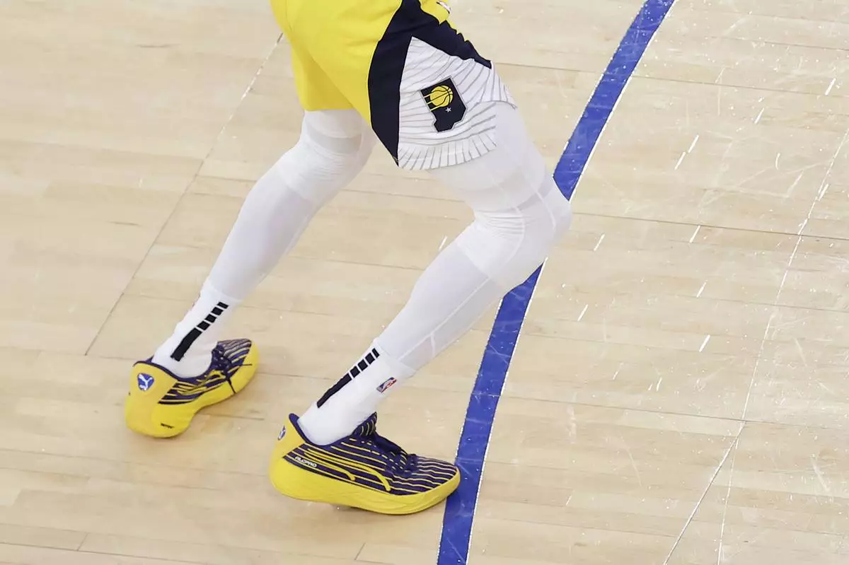 Indiana Pacers guard Tyrese Haliburton (0) steps on the 3-point line as he shoots a 2-point shot against the New York Knicks to tie the score at the end of regulation in Game 1 of the NBA basketball Eastern Conference final, Wednesday, May 21, 2025, in New York. (AP Photo/Adam Hunger)