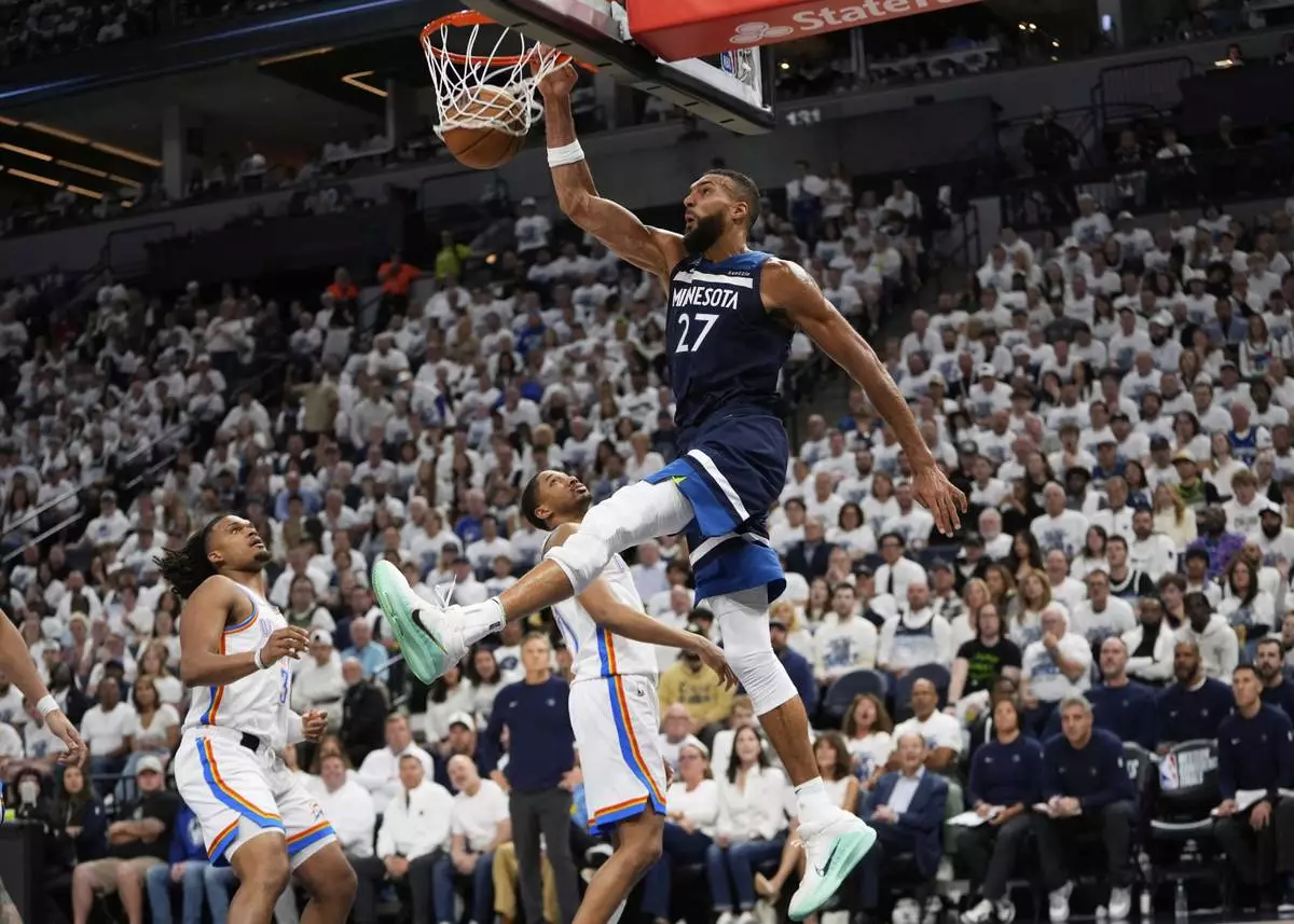 Minnesota Timberwolves center Rudy Gobert (27) dunks against the Oklahoma City Thunder during the second half of Game 3 of the Western Conference finals of the NBA basketball playoffs, Saturday, May 24, 2025, in Minneapolis. (AP Photo/Abbie Parr)