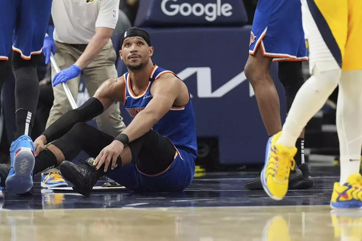 New York Knicks guard Josh Hart (3) looks up from the floor after his sixth foul during the second half of Game 4 of the Eastern Conference finals of the NBA basketball playoffs against the Indiana Pacers in Indianapolis, Tuesday, May 27, 2025. (AP Photo/Michael Conroy)