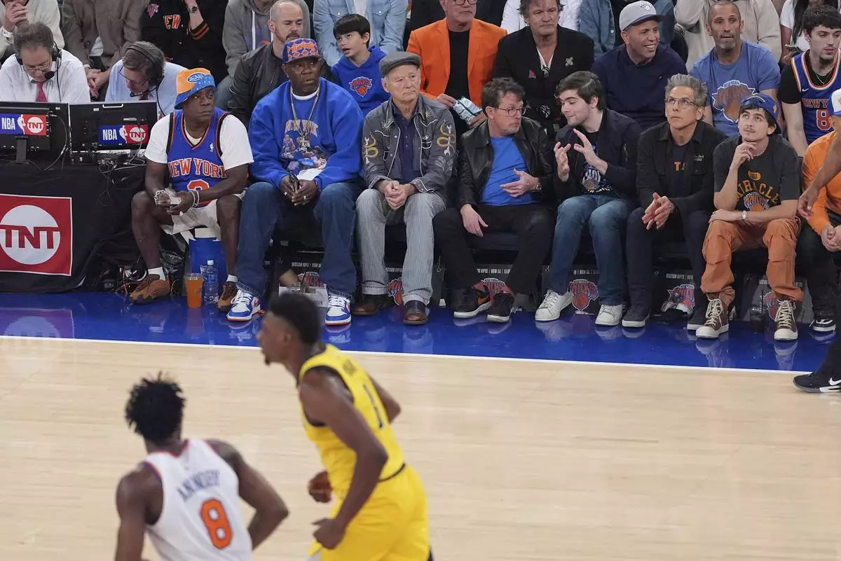 From left, Tracy Morgan, Bill Murray, third from left, Michael J. Fox, Ben Stiller, second from right, and Timothee Chalamet watch play between the New York Knicks and the Indiana Pacers during the first quarter of Game 2 of the NBA basketball Eastern Conference final, Friday, May 23, 2025, in New York. (AP Photo/Frank Franklin II)