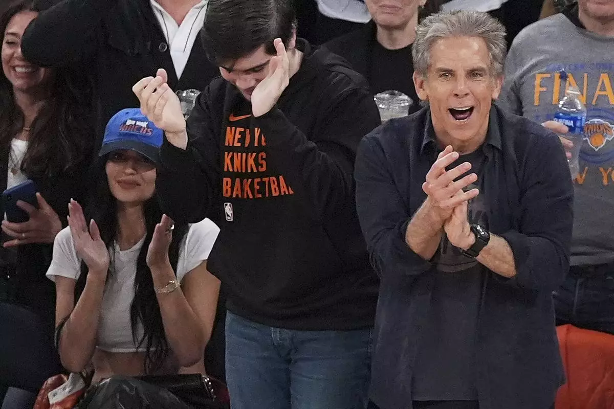 Ben Stiller, right, reacts during the fourth quarter of Game 5 of the NBA basketball Eastern Conference finals between the New York Knicks and the Indiana Pacers, Thursday, May 29, 2025, in New York. (AP Photo/Frank Franklin II)