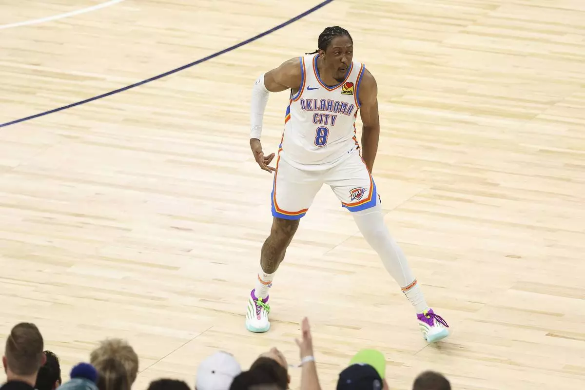 Oklahoma City Thunder forward Jalen Williams reacts in front of fans during the second half of Game 4 of the Western Conference finals of the NBA basketball playoffs against the Minnesota Timberwolves Monday, May 26, 2025, in Minneapolis. (AP Photo/Matt Krohn)