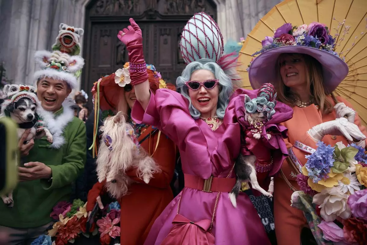 Revelers wearing decorated hats and costumes participate in the annual Easter Parade and Bonnet Festival in front of St. Patrick's Cathedral on Sunday, April 20, 2025, in New York. (AP Photo/Andres Kudacki)
