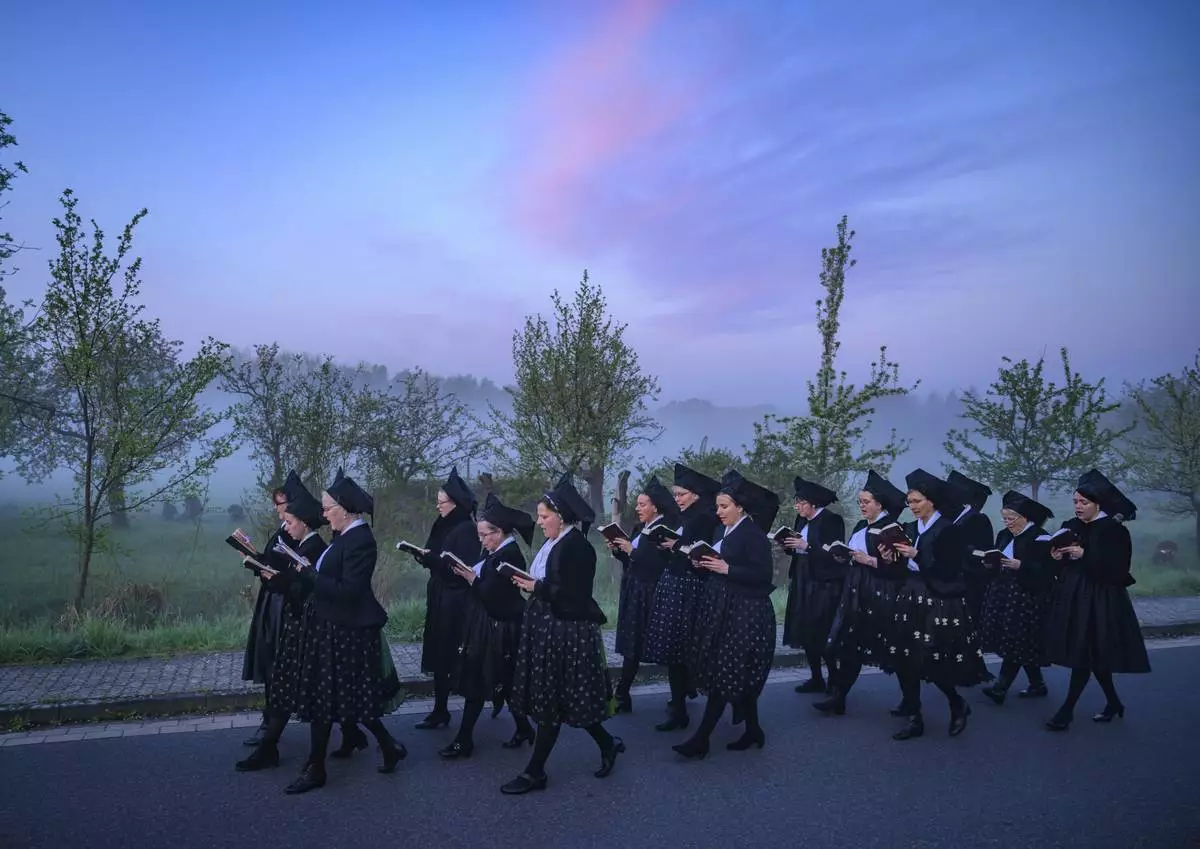 Women in black church costumes sing Easter hymns as they walk through the small Lusatian village of Maust near Cottbus Sunday, April 20, 2025. (Patrick Pleul/dpa/dpa via AP)