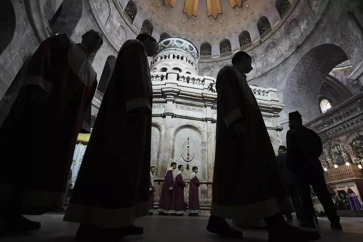 Christian pilgrims and clergymen participate in the Easter Sunday Mass at the Church of the Holy Sepulcher, the site where according to tradition Jesus was crucified and buried, in Jerusalem's Old City, Sunday, April 20, 2025. (AP Photo/Mahmoud Illean)