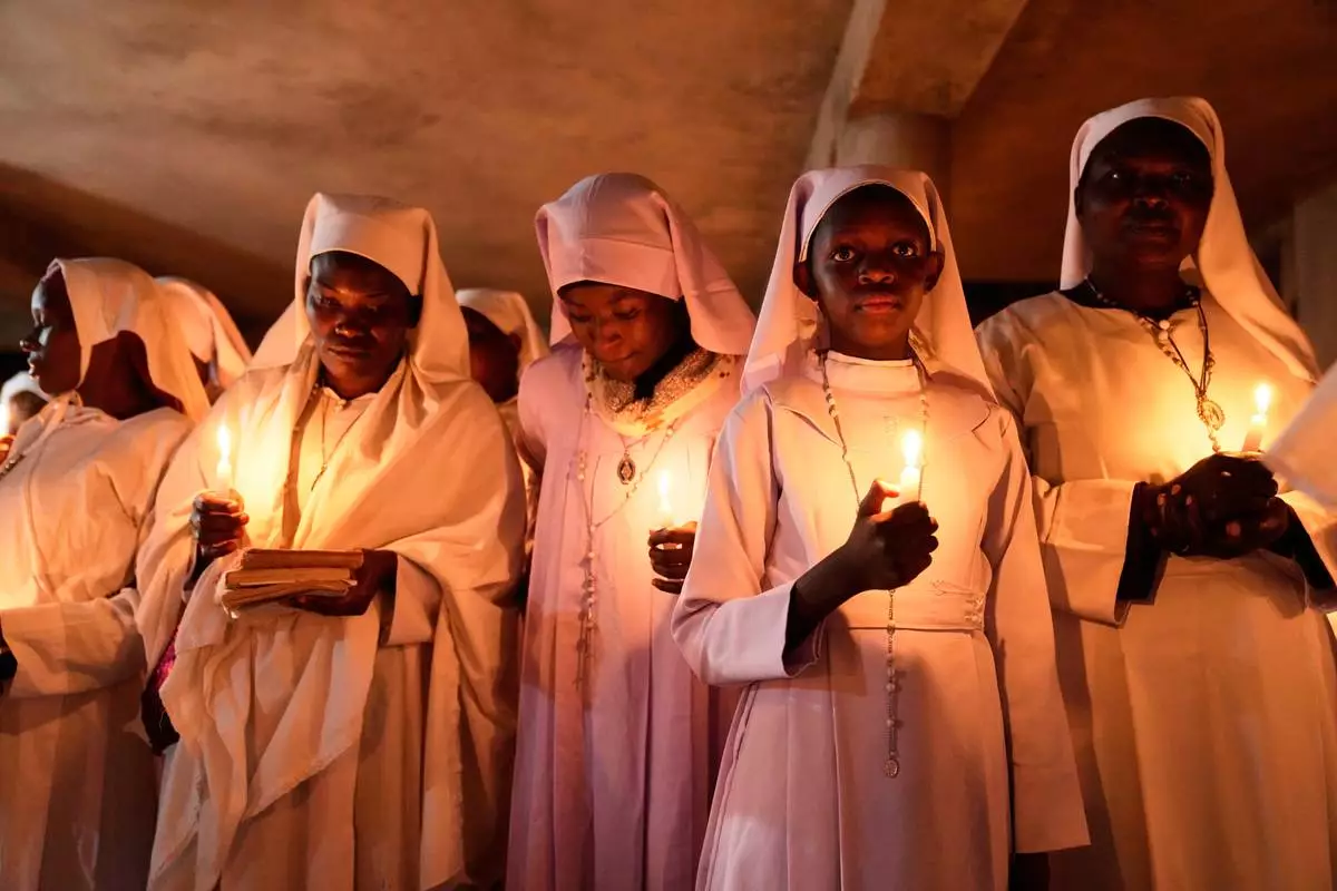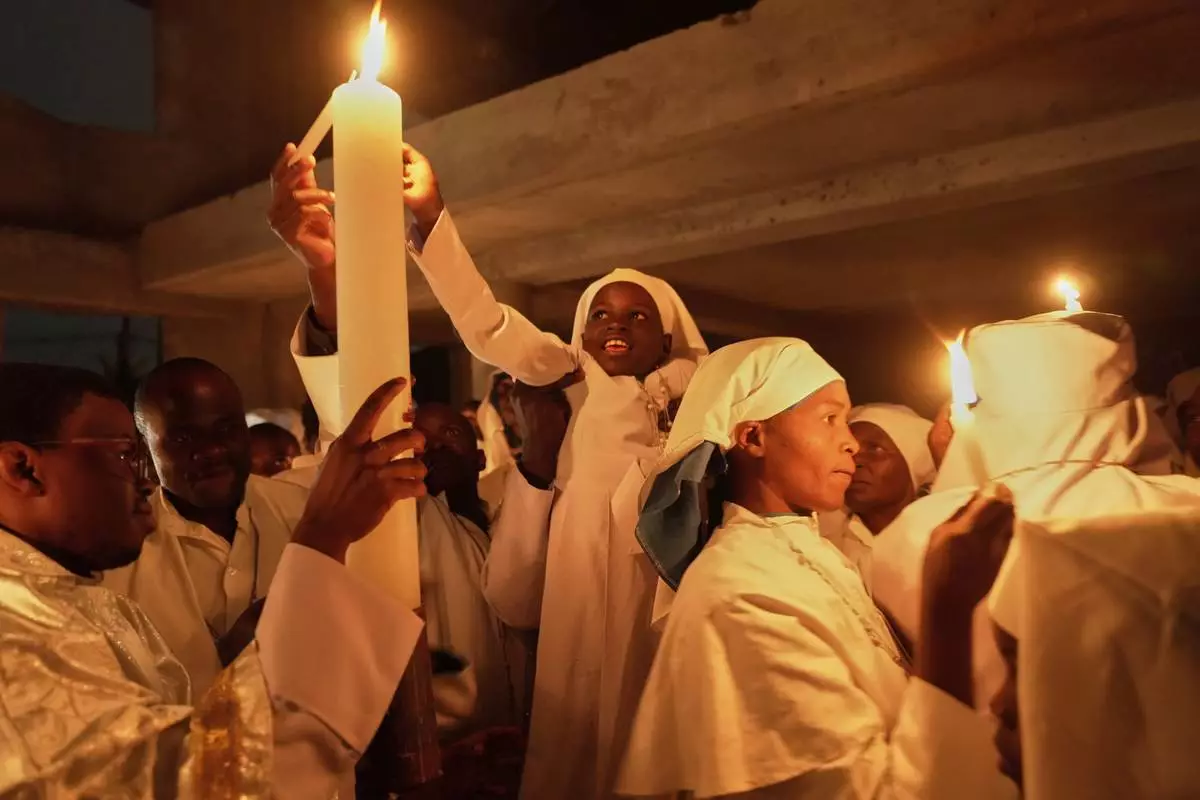 Christian faithful of the Legio Maria African Mission, attend the Easter vigil Mass in the informal settlement of Kibera in Nairobi, Kenya, Saturday, April 19, 2025. (AP Photo/Brian Inganga)