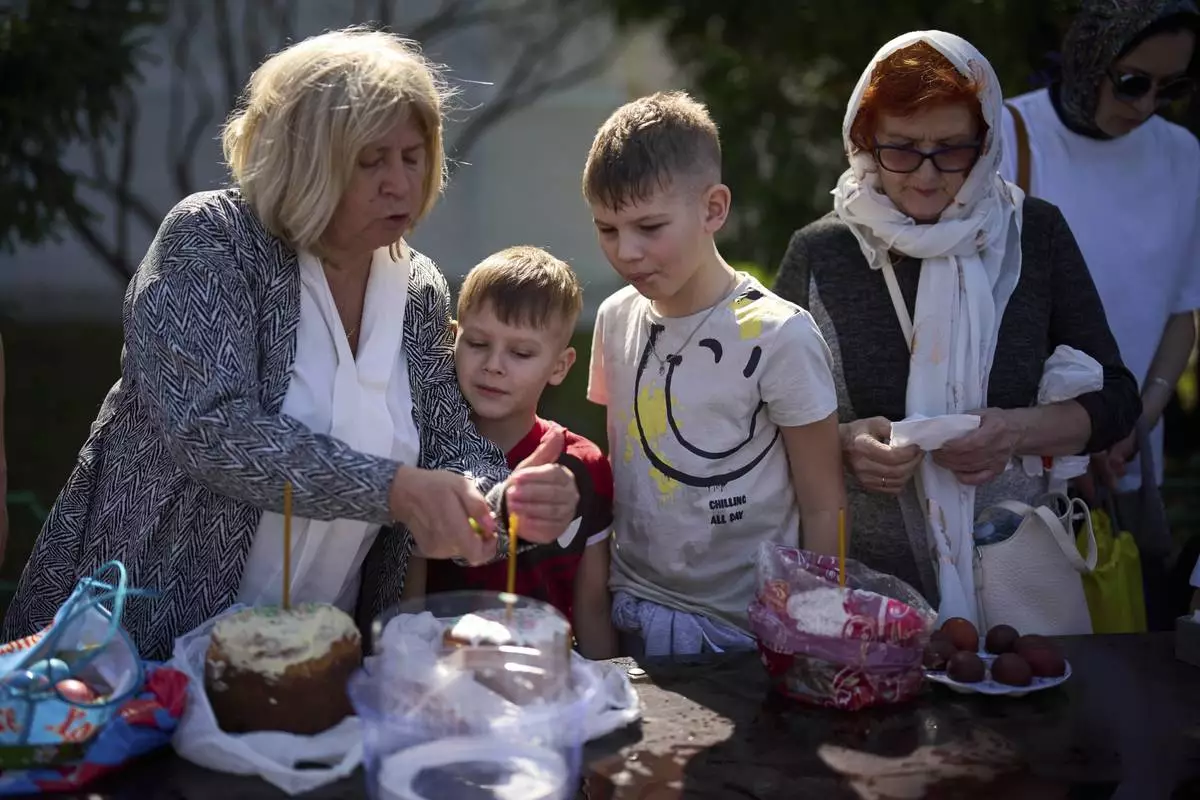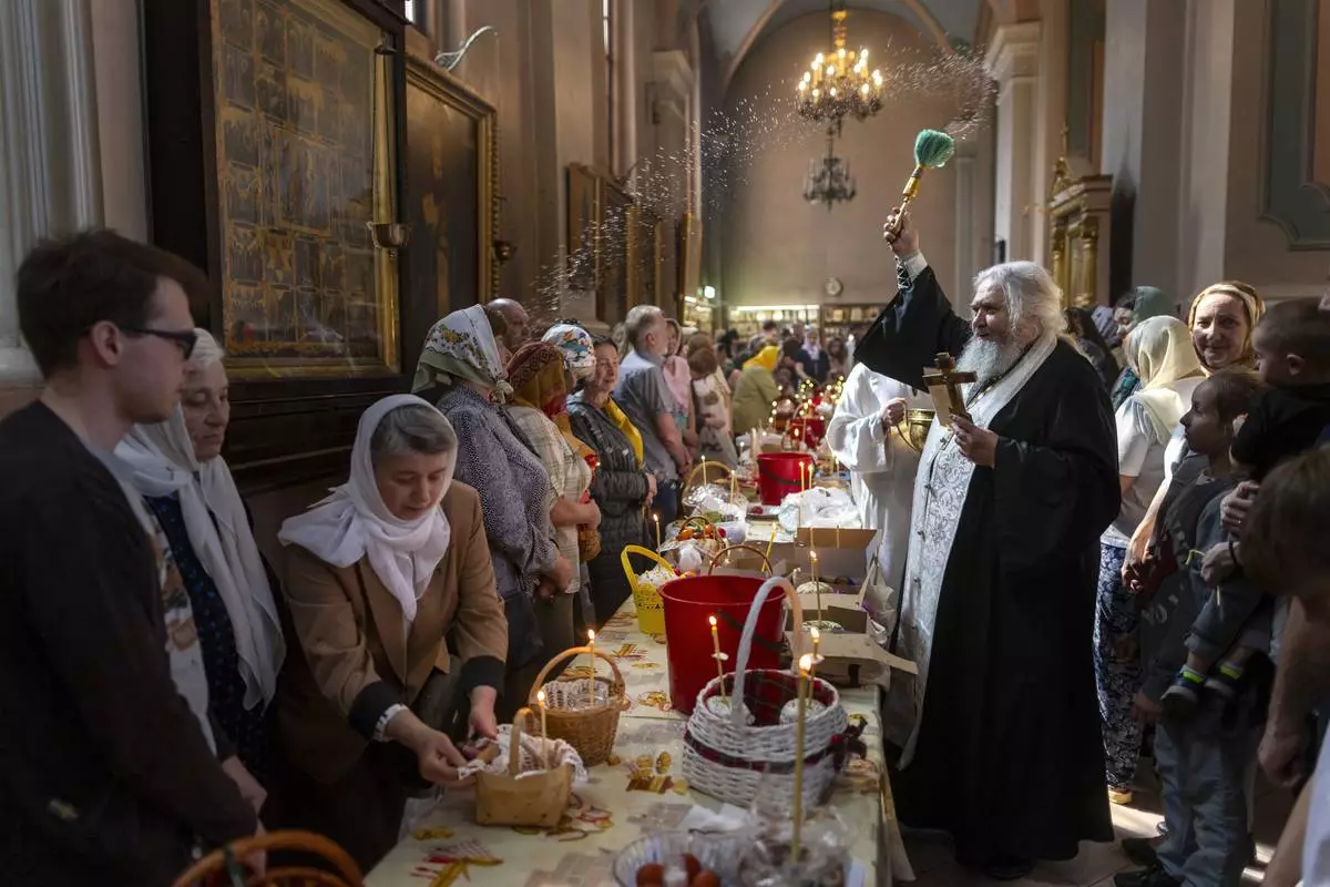 Priests bless Easter baskets during celebration of the Orthodox Easter in Lviv, Ukraine, April 19, 2025. (AP Photo/Mykola Tys)