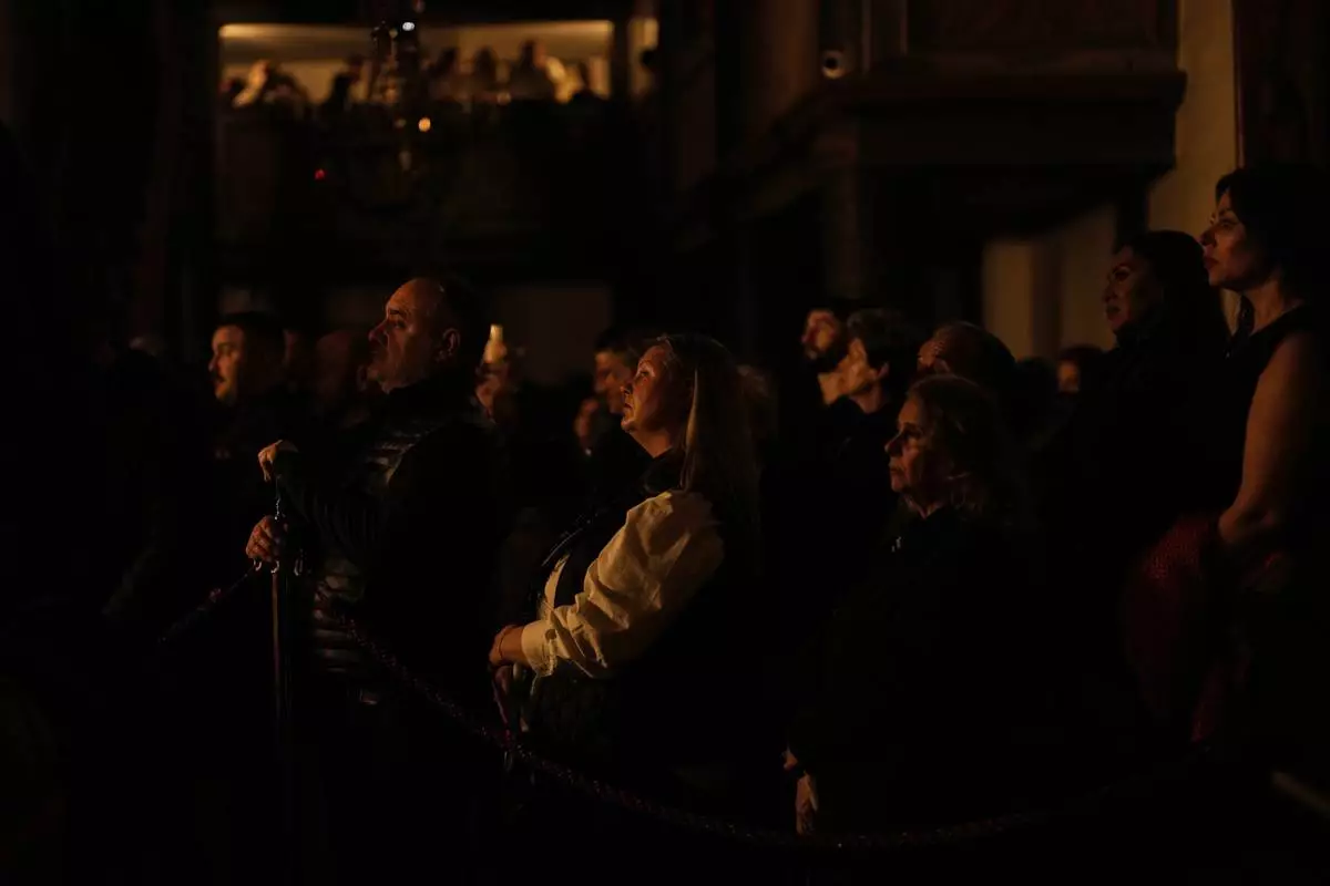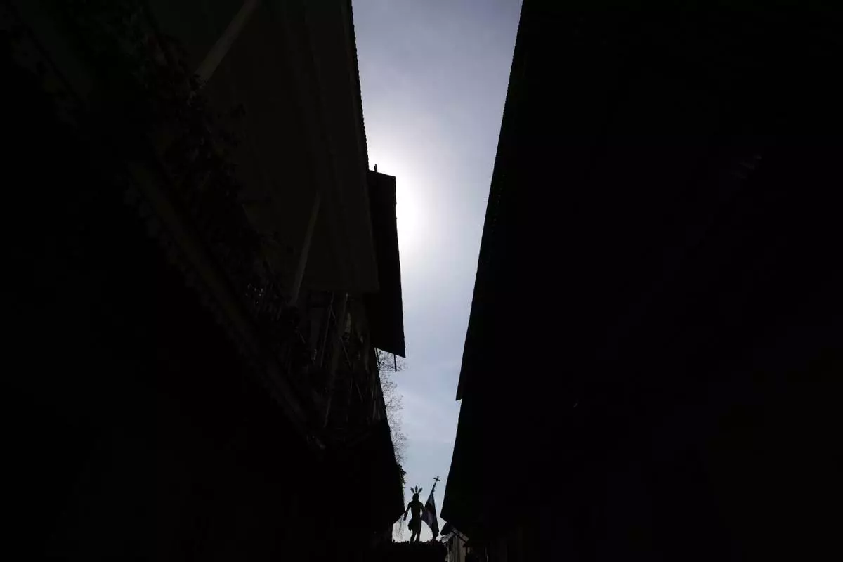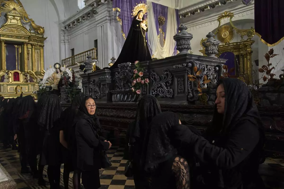 Devotees wait to start the Virgin of Solitude procession in commemoration for the death of her son, Jesus Christ at Calvary, in Antigua, Guatemala, on Holy Saturday, April 19, 2025. (AP Photo/Moises Castillo)