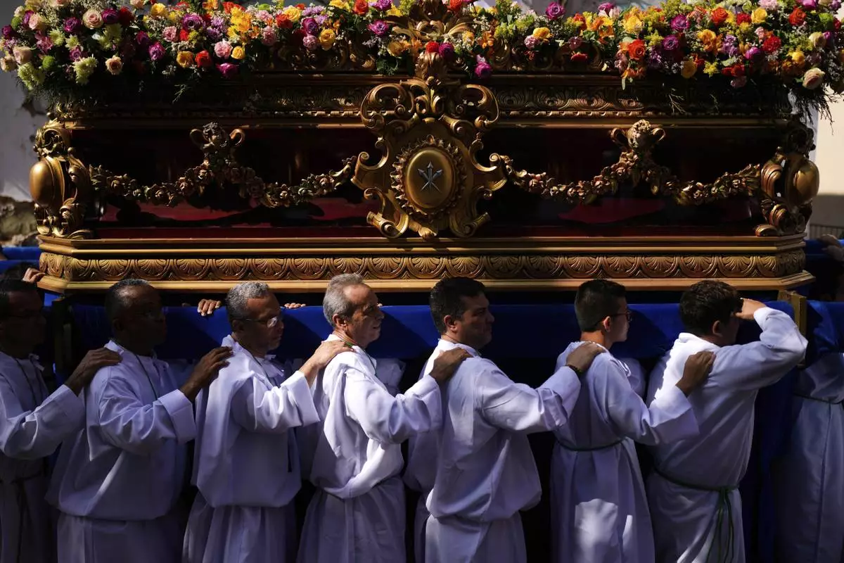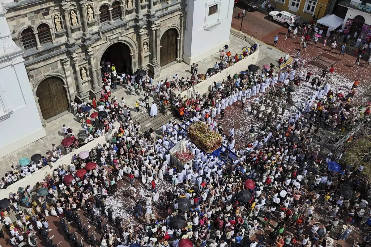 People attend an Easter procession in Panama City's Casco Viejo, Sunday, April 20, 2025. (AP Photo/Matias Delacroix)