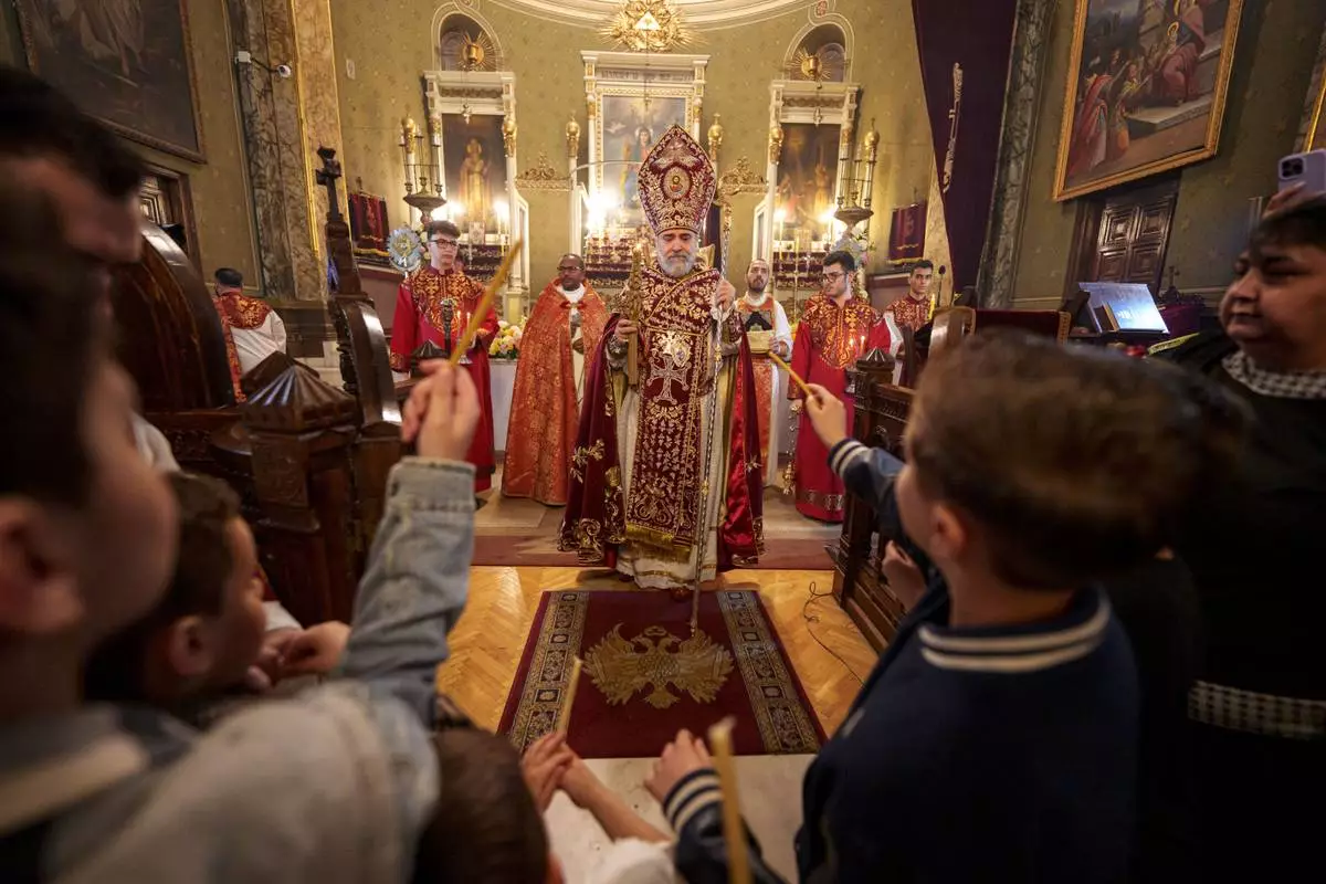 Children hold candles as Iraq-born Armenian church Archbishop Datev Hagopian prepares to share the holy light during the Orthodox Easter service at the Armenian cathedral in Bucharest, Romania, Saturday, April 19, 2025. (AP Photo/Andreea Alexandru)