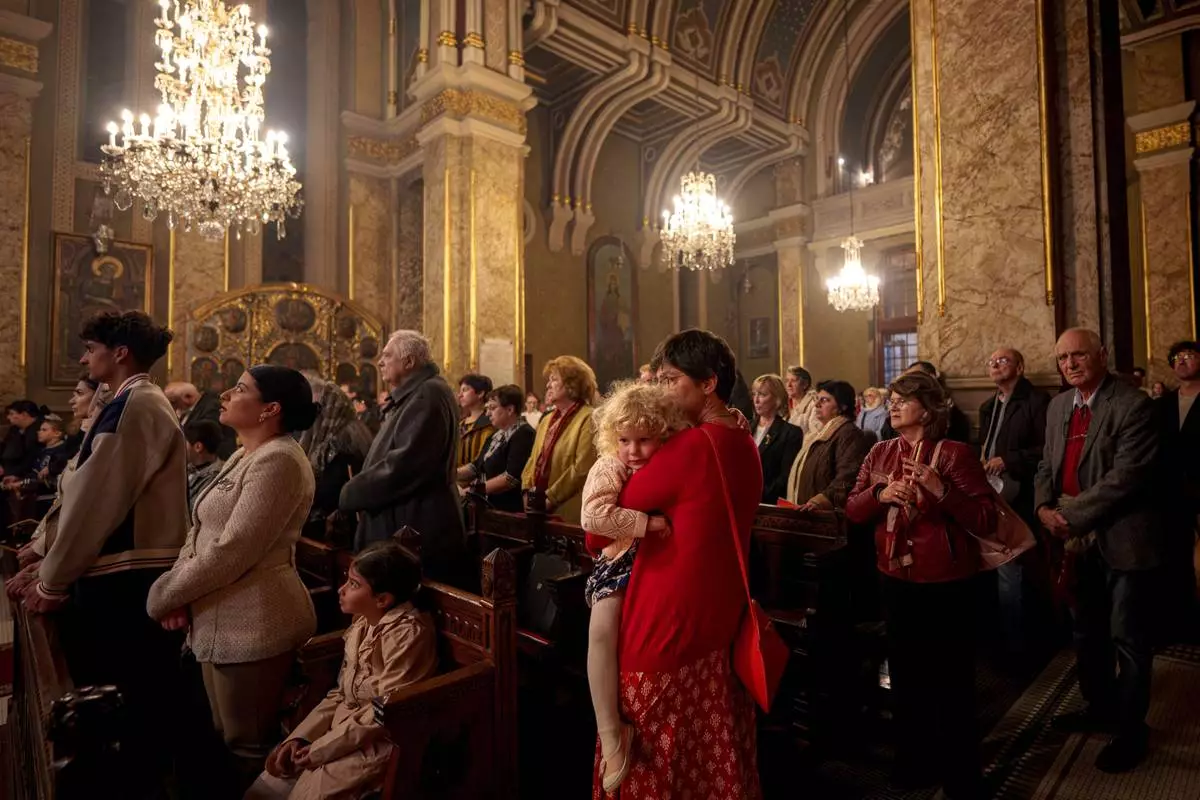 A woman holds a child during the Orthodox Easter service at the Armenian cathedral in Bucharest, Romania, Saturday, April 19, 2025. (AP Photo/Andreea Alexandru)