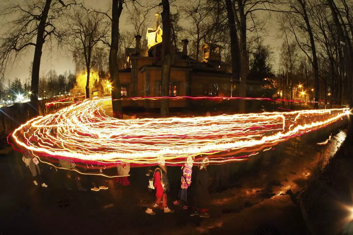 In this long exposure photo, Orthodox believers walk with candles around a church during Orthodox Easter midnight service in St. Petersburg, Russia, Sunday, April 20, 2025. (AP Photo/Dmitri Lovetsky)