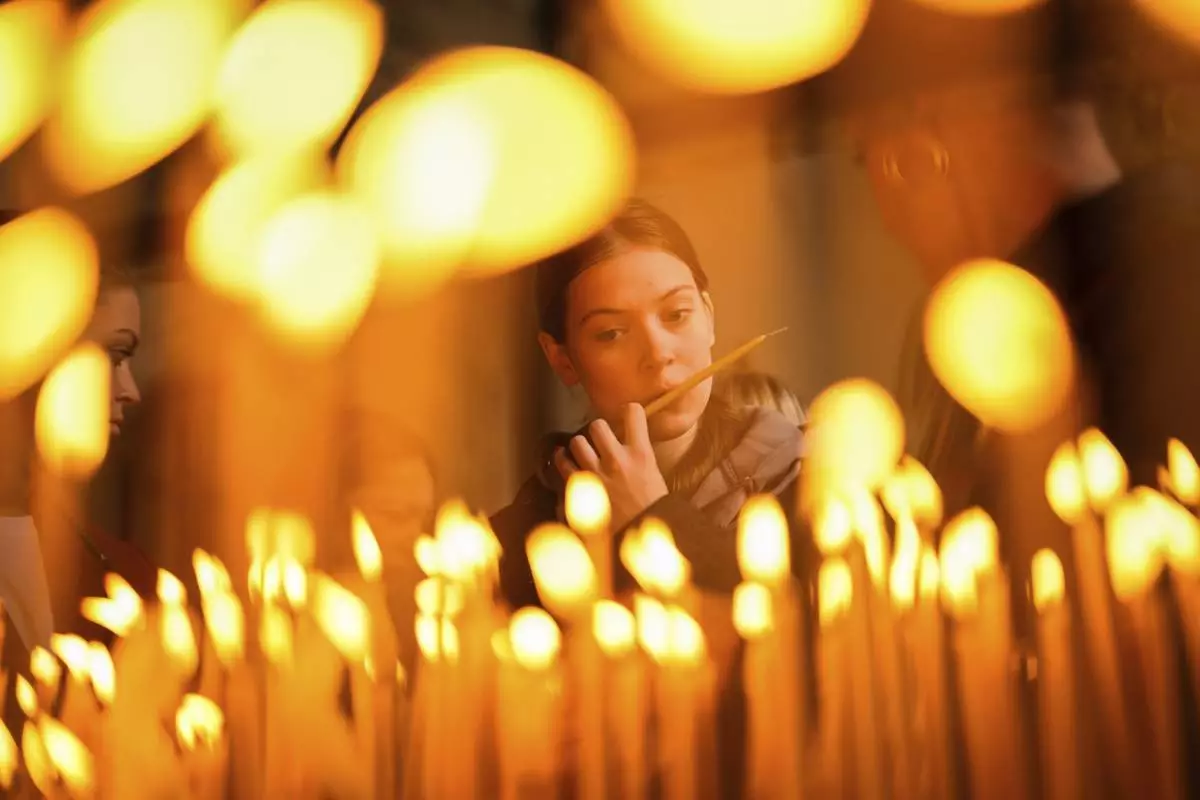 A Christian Orthodox worshipper lights candles during the Easter Sunday Resurrection liturgy, marking the end of the Holy Week at the Patriarchal Church of St. George in Istanbul, Turkey, Sunday, April 20, 2025. (AP Photo/Emrah Gurel)