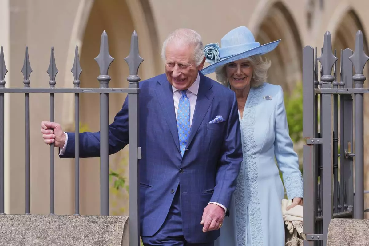 Britain's King Charles III and Queen Camilla leave after attending the Easter Matins Service at St. George's Chapel, Windsor Castle, England, Sunday, April 20, 2025. (AP Photo/Kirsty Wigglesworth, Pool)