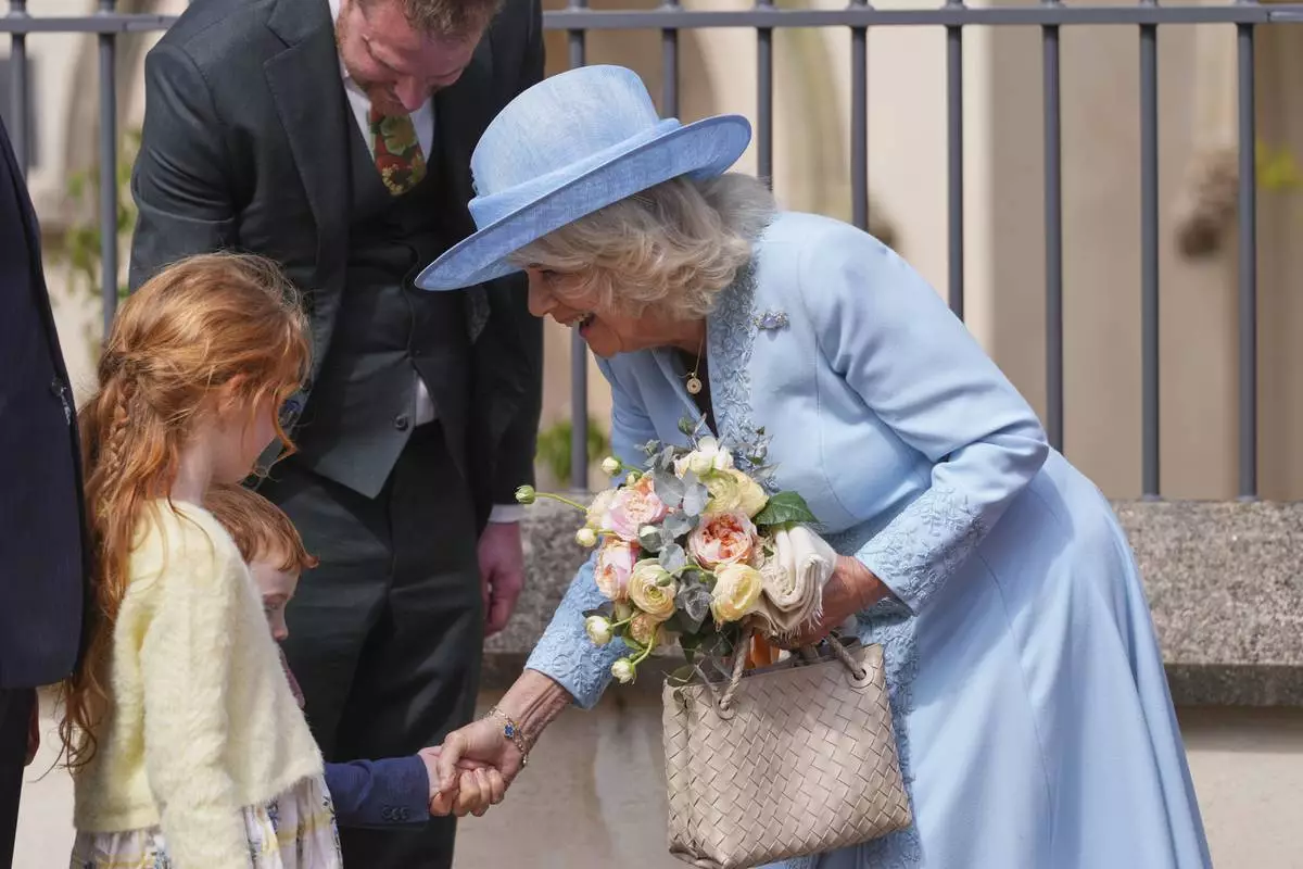 Queen Camilla shakes hands with the children who presented her with as posy as she leaves after attending the Easter Matins Service at St. George's Chapel, Windsor Castle, England, Sunday, April 20, 2025. (AP Photo/Kirsty Wigglesworth, Pool)