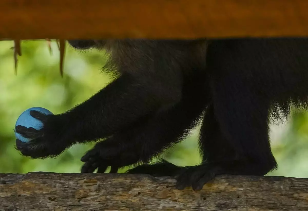 A monkey holds an Easter egg given to him by staff at the Buinzoo in Santiago, Chile, Sunday, April 20, 2025. (AP Photo/Esteban Felix)