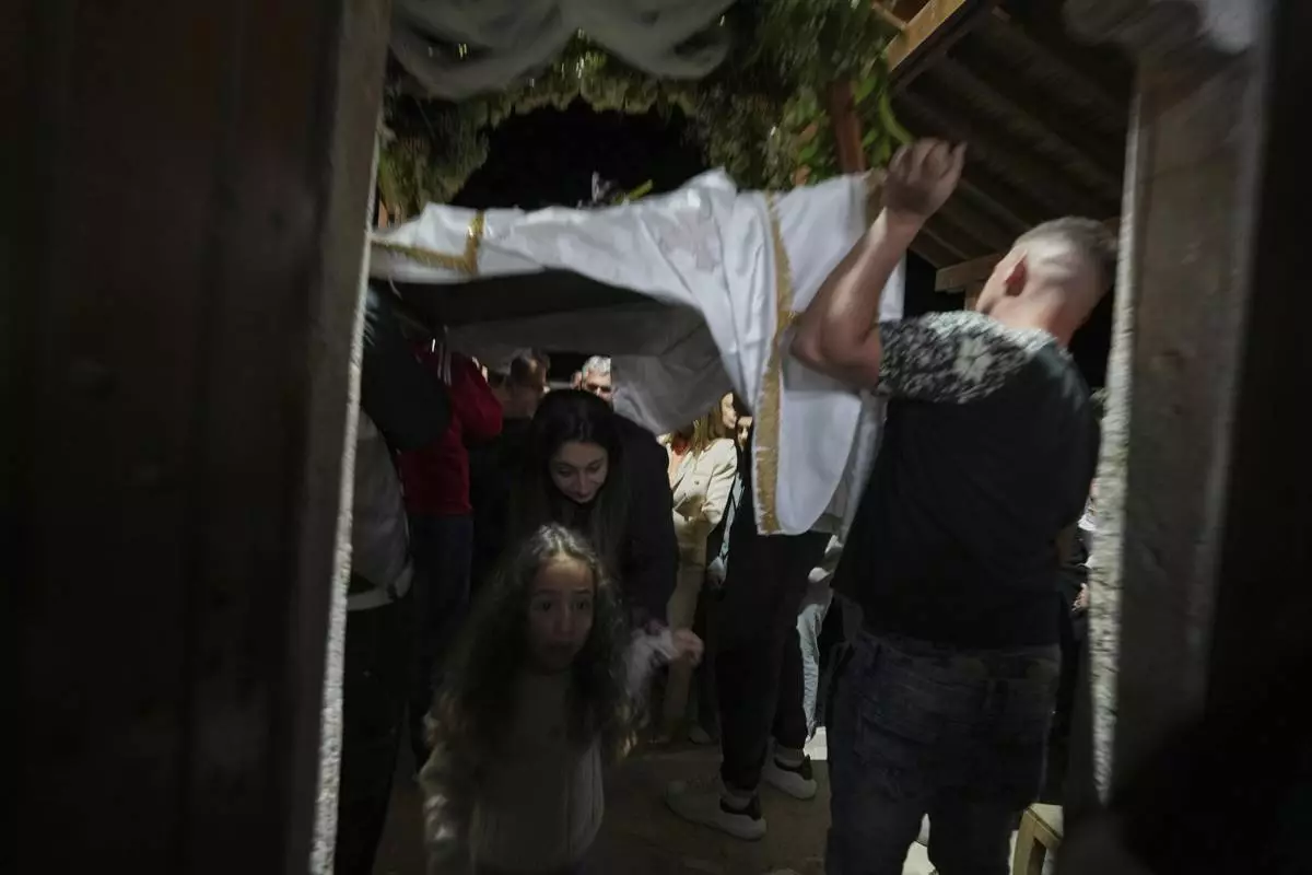 Greek Orthodox Christian worshipers pass under the Epitaphios depicting Jesus Christ's preparation for burial, during the Good Friday procession at Agios Epifanios church in Droushia village in Paphos district on holy Friday, April 18, 2025. (AP Photo/Petros Karadjias)