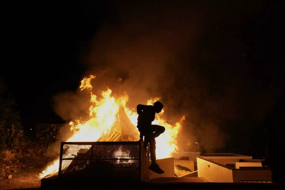 A young man is seen in front of the traditional Easter bonfire, or lambratzia, where effigies of Judas Iscariot, the disciple believed to have betrayed Jesus, are burned during Easter celebrations at the church of Agios Epifanios in the village of Droushia in the Paphos district on the Akamas peninsula on holy Saturday, April 19, 2025, in Cyprus. (AP Photo/Petros Karadjias),