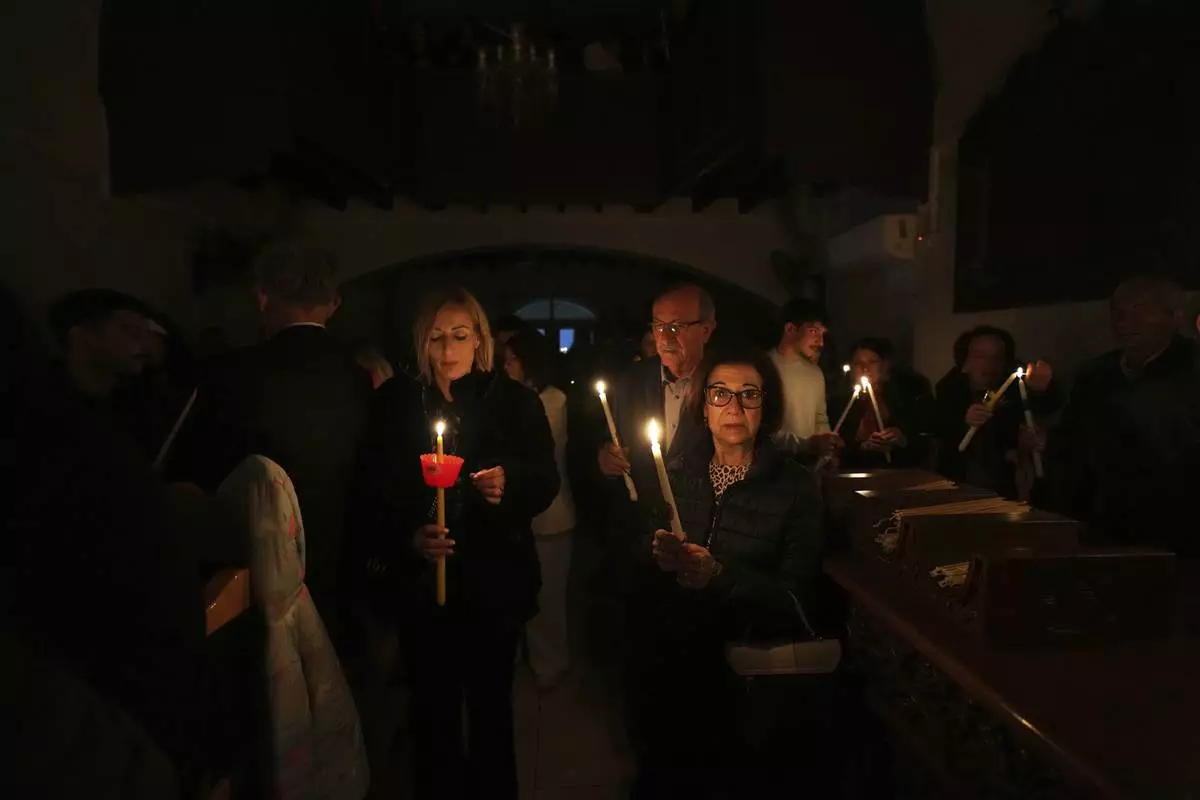 Christian Orthodox faithful take the holy light at the Agios Epifanios church during Easter celebrations in Droushia in the Paphos district on the Akamas peninsula of Cyprus, early Sunday, April 20, 2025. (AP Photo/Petros Karadjias)