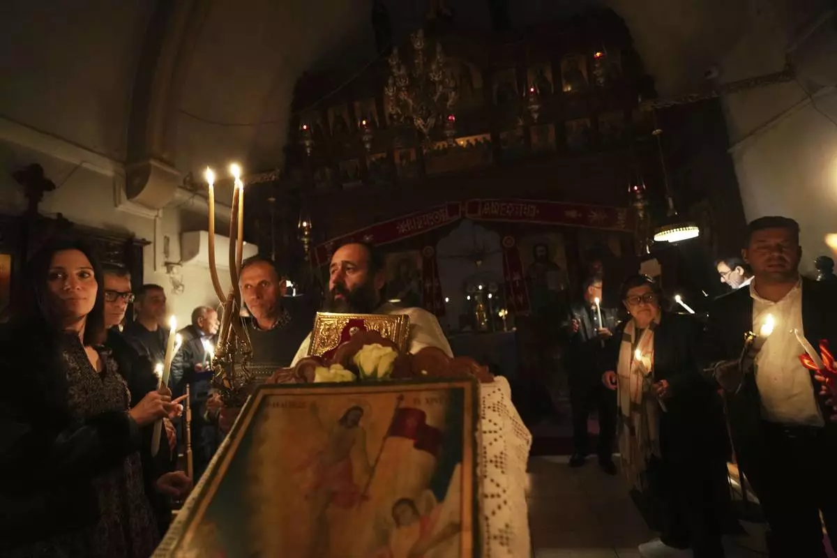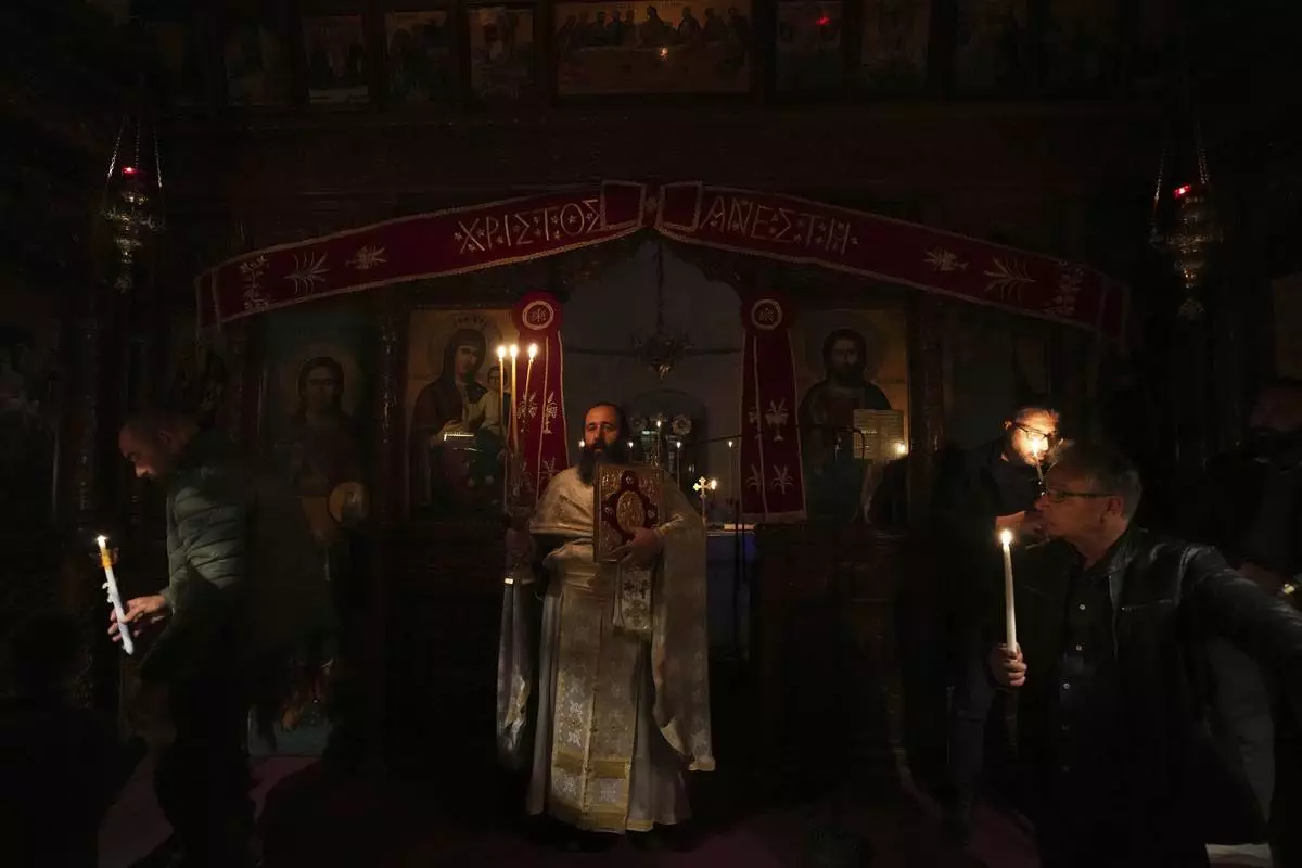 A Christian Orthodox priest takes the holy light at the Agios Epifanios church during Easter celebrations in Droushia in the Paphos district on the Akamas peninsula of Cyprus, early Sunday, April 20, 2025. (AP Photo/Petros Karadjias)