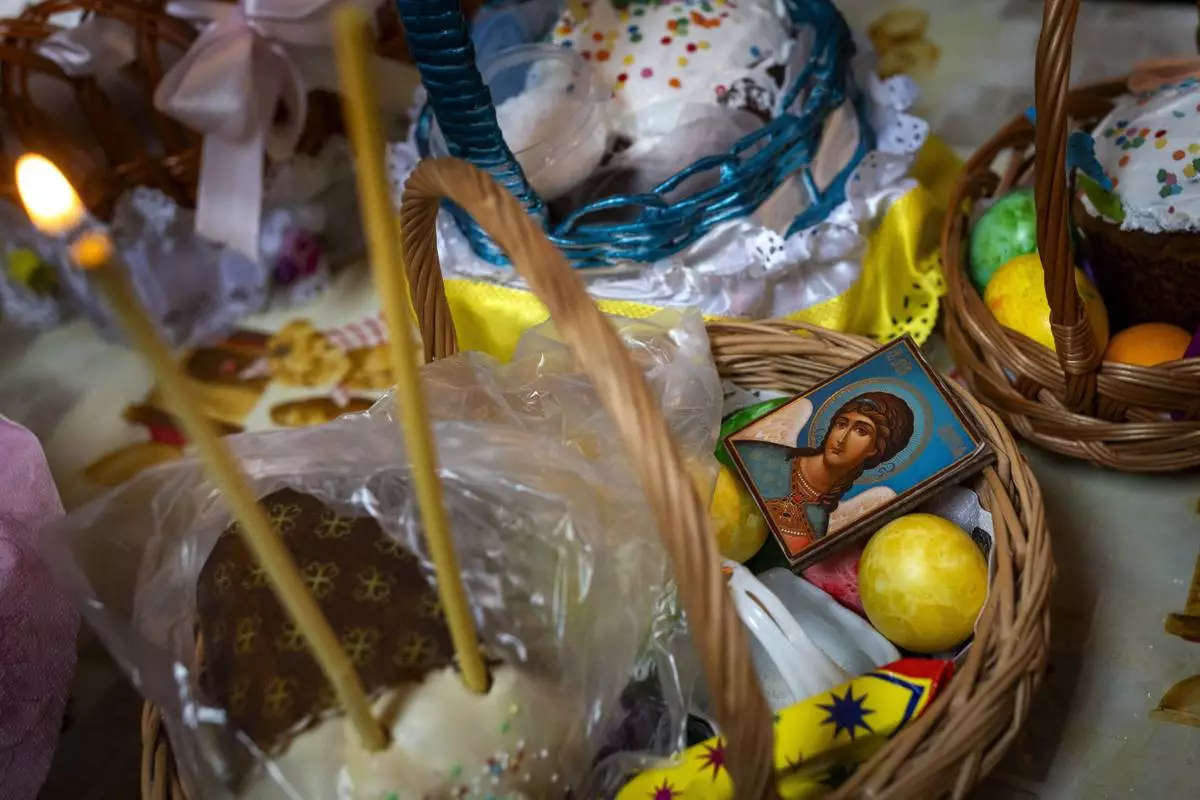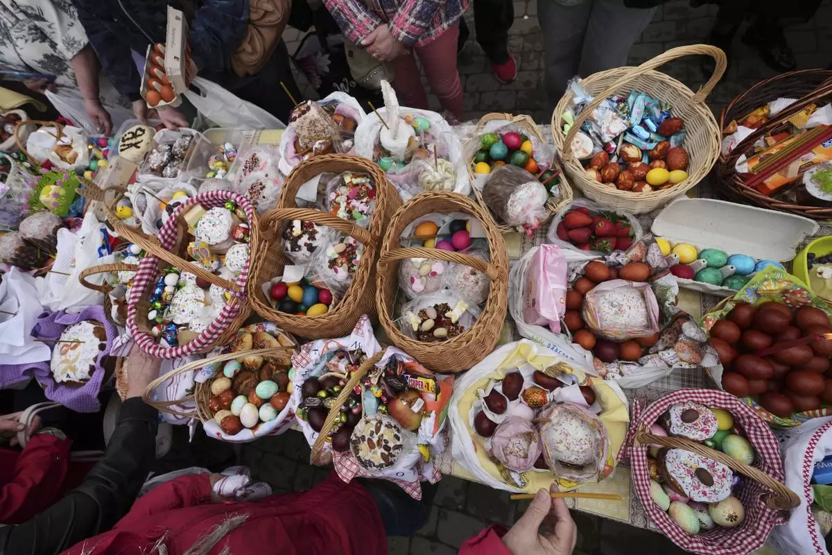Easter baskets are seen during celebration of the Orthodox Easter in Lviv, Ukraine, April 19, 2025. (AP Photo/Mykola Tys)