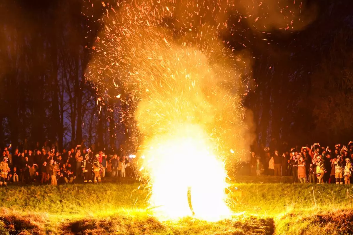 Members of the Dechenverein Lügde ignite the straw in a wooden wheel, which then rolls down a slope on fire during Easter celebrations in Lügde, Germany, on Sunday, April 20, 2025. (Christoph Reichwein/dpa via AP)